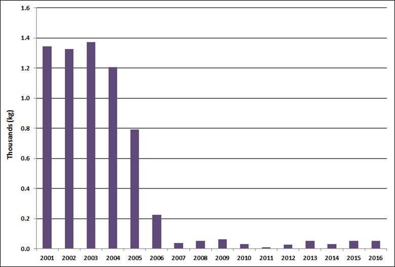 Bar graph showing pipe tobacco sales in Prince Edward Island, Northwest Territories, Nunavut and Yukon from 2001 to 2021. Pipe tobacco unit sales decreased from 1,343 kilograms in 2001 to 16 kilograms in 2021.
