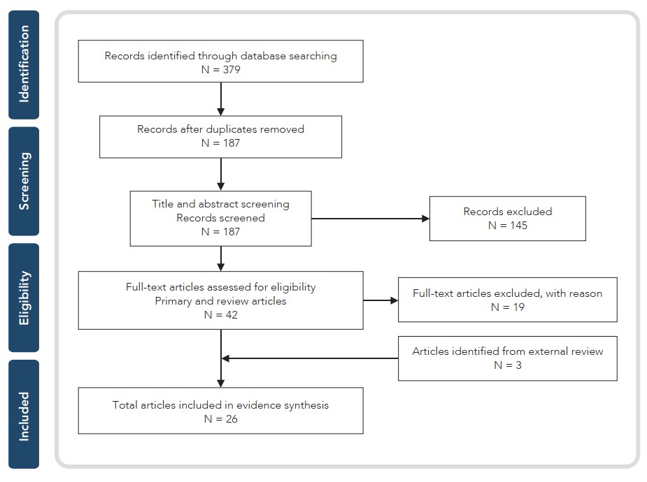 Figure A1 depicts the flow of information through the different phases of a systematic review and maps out the number of records identified, included and excluded, and the reasons for exclusions. For the evidence review: 379 records were identified through database searching, of which 187 records remained after the duplicates were removed. 187 records were then screened for title and abstract screening, at which point 145 records were excluded and the full-text of 42 review articles were assessed for eligibility. Of these full-text articles, 19 were excluded with reason. 3 articles were identified from external review. In total, 26 articles were included in the evidence synthesis.
