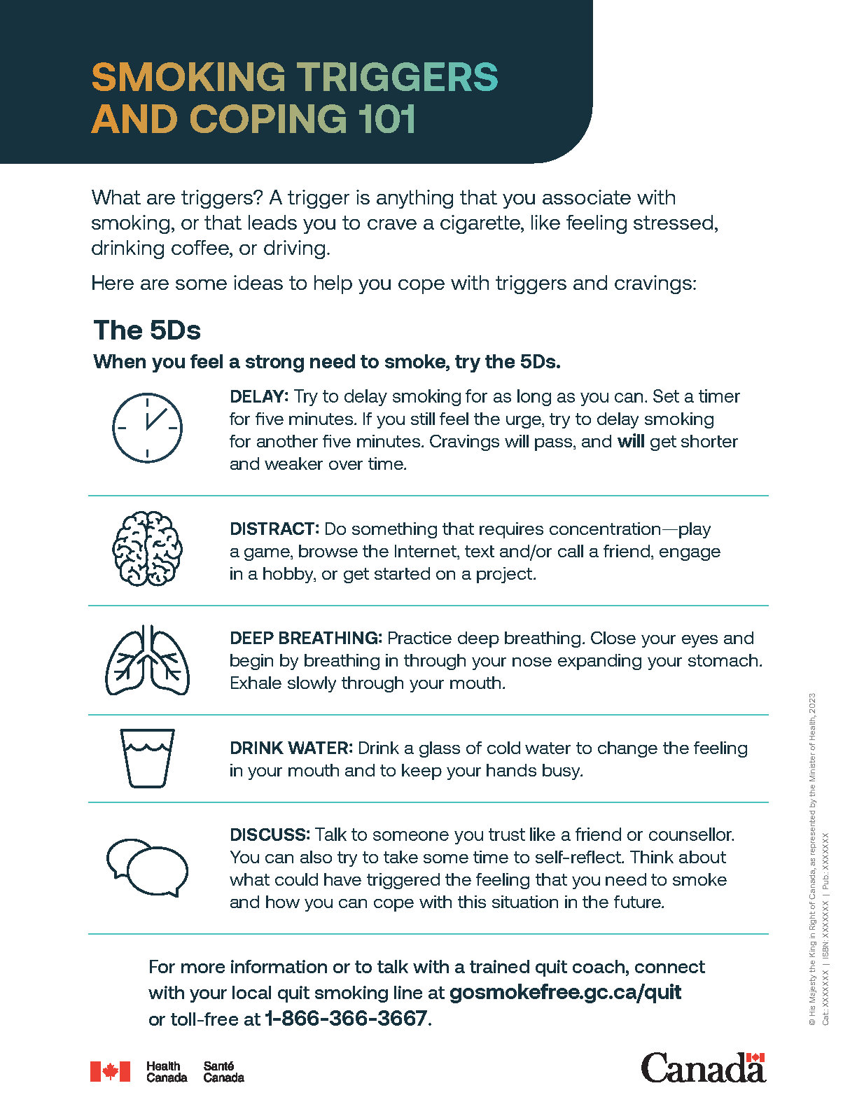 For more information or to talk with a trained quit coach, connect with your local quit smoking line at gosmokefree.gc.ca/quit or toll-free at 1-866-366-3667.