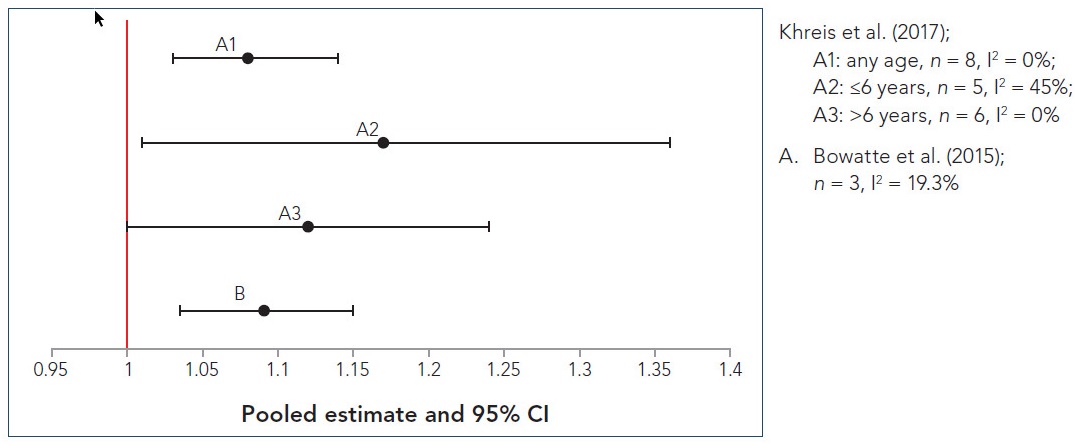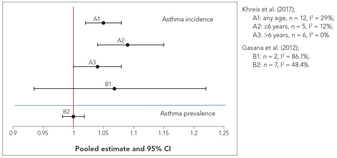 - Figure 4.3 Forest plot of pooled ORs from SR-MAs for asthma incidence in childhood standardized to an increment of 0.5 × 10−5/m of BC; n represents the number of studies included in the meta-analysis, and I2 represents the heterogeneity