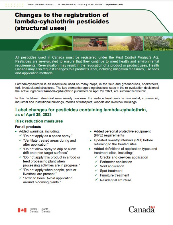 Lambda-cyhalothrin is an insecticide used on many crops, in the field and greenhouses, shelterbelts, turf, livestock and structures. The key elements regarding structural uses in the re-evaluation decision of the active ingredient lambda-cyhalothrin published on April 29, 2021, are summarized below.