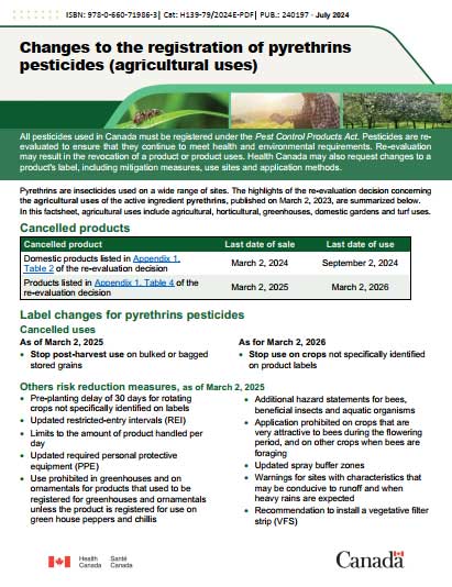 Re-evaluation decision RVD2023-06, Pyrethrins and its associated end-use products. The Health Canada-approved label is the official document for law enforcement. In case of discrepancy with the contents of this information sheet, the information on the label prevails.