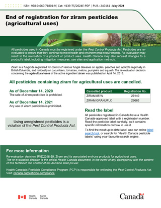 Re-evaluation decision, RVD2018-39, Ziram and its associated end-use products for agricultural uses. The Health Canada-approved label is the official document for enforcement purposes. In the event of any discrepancy with the contents of this factsheet, the information on the label shall prevail.
