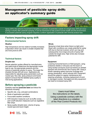 - Detailed information on best practices for the Management of pesticide spray drift. This guide is the official Health Canada document. In the event of any discrepancy with the content of this factsheet, the content of the guide shall prevail.