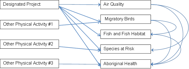By mapping cause-and-effect relationships among projects, other physical activities, and VCs, possible cumulative effects can be identified. Network and systems analyses are most applicable to the scoping of the cumulative effects assessment, and can be helpful to identify the pathways among a project, multiple other physical activities, and multiple VCs.