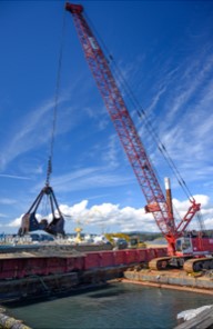 - This photo shows an excavator dredging and loading sediment in the Esquimalt Harbour.