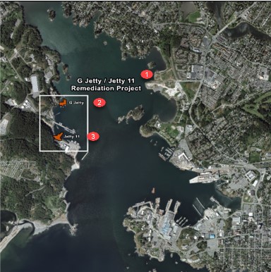 - The G Jetty/Jetty 11 Remediation Project Area Map figure shows the location of the G Jetty/Jetty 11 Remediation Project in Esquimalt Harbour including labels for G Jetty and Jetty 11.