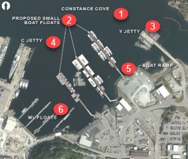 - The Small Boat Floats Location Map figure shows a schematic drawing of the Small Boat Floats Project in Esquimalt Harbour.