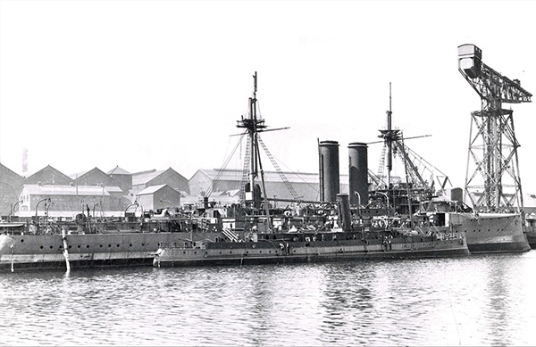 The future CGS Canada fitting out in the Vickers yard at Barrow-in-Furness, 1904, lying outboard of HMS Dominion, also still under construction and whose first captain in 1906 would be Captain C.E. Kingsmill, Royal Navy (RN).