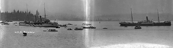 HMCS Rainbow watches over the SS Komagata Maru in Vancouver, July 1914.