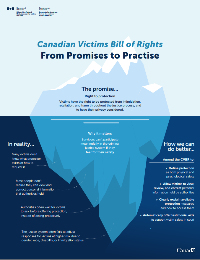 Victims have the right to be protected from intimidation, retaliation, and harm throughout the justice process, and to have their privacy considered. |