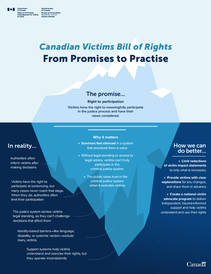 - Victims often don’t know who to ask, where to go, when to ask, or what to request —and must keep asking at every stage of the Canadian Justice System (CJS)