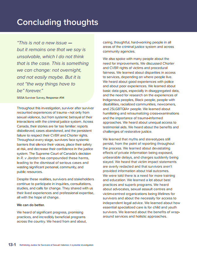 Despite these realities, survivors and stakeholders continue to participate in inquiries, consultations, studies, and calls for change. They shared with us their lived experiences and professional expertise, all with the hope of change.