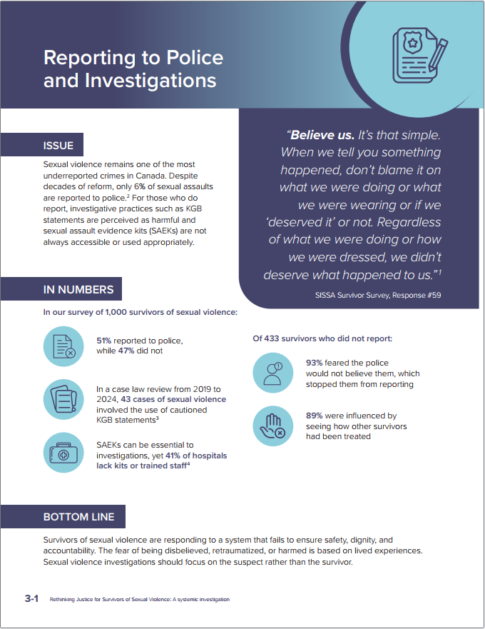 Sexual violence is one of the most underreported crimes in Canada. Only 6% of sexual assaults are reported to police.[6] Despite decades of reforms, criminal justice responses to sexual violence continue to fail survivors. Reporting sexual violence is often framed as an individual choice, but survivors consistently indicate that their silence is in response to systemic barriers, institutional failures, and inequality rather than personal unwillingness. Further complicating this picture, investigative tools like KGB statements and SAEKs can reinforce these barriers, intensifying survivors’ hesitation to engage with police. Public safety and confidence in the criminal justice system (CJS) remain at risk until the system confronts the structural conditions silencing survivors.