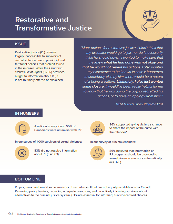 Restorative justice (RJ) remains largely inaccessible to survivors of sexual violence due to provincial and territorial policies that prohibit its use in these cases. While the Canadian Victims Bill of Rights (CVBR) provides a right to information about RJ, it is not routinely offered or explained.