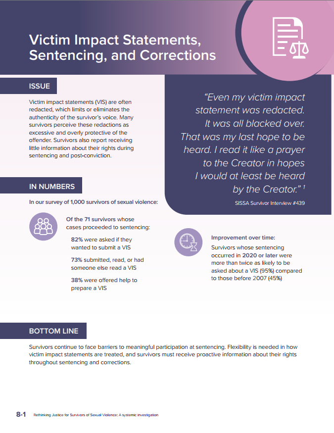 Survivors continue to face barriers to meaningful participation at sentencing. Flexibility is needed in how victim impact statements are treated, and survivors must receive proactive information about their rights throughout sentencing and corrections.