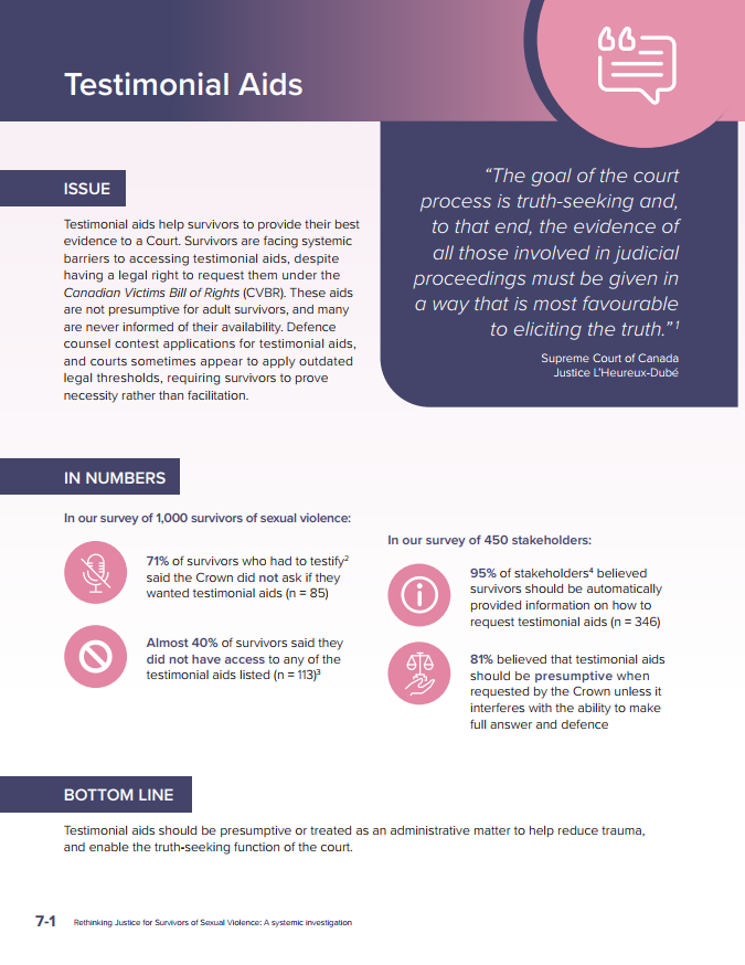 - The 2022 report from the Standing Committee on Justice and Human Rights discussed testimonial aids as an option of support and highlighted the need for survivors to have choices such as testifying on video or in person.[19]