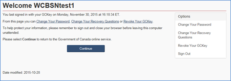 Image of a webpage showing a welcome message to new users. Options to change the password, the recovery questions, or revoke the GCKey are available. Users would click the "Continue" button at the bottom to proceed to the WD Web Portal.
