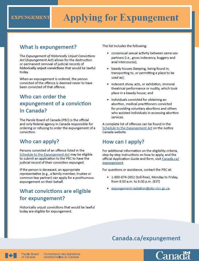 The Parole Board of Canada (PBC) is the official and only federal agency in Canada responsible for ordering or refusing to order the expungement of a conviction.