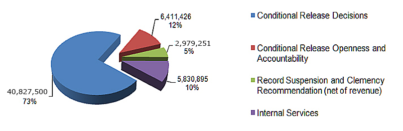 The Board delivers program areas grounded in legislation: conditional release, record suspensions, and clemency investigations. The PBC also manages a range of internal services that provides critical support for program delivery. The conditional release program was the largest area and accounted for 85% of annual program expenditures (including conditional release decisions and openness and accountability).