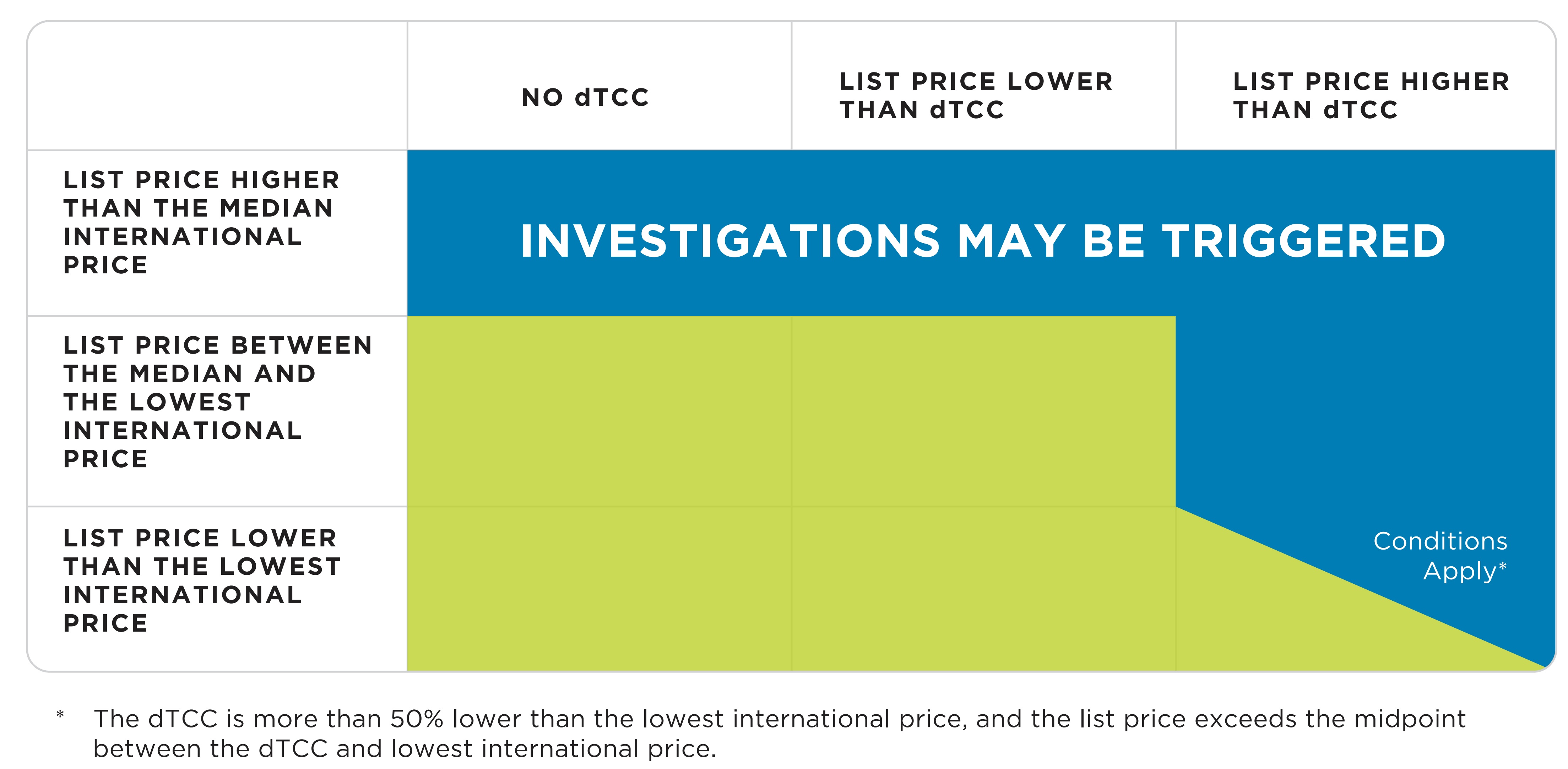 - The list price exceeds the midpoint between the top of the dTCC and lowest international price for the PMPRB11, and the top of the dTCC is more than 50% lower than the lowest international price.