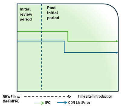 This chart illustrates the case where, during the initial review, the Canadian list price is below the International Price Comparison (IPC). During the post-initial period, the Canadian list price and the IPC decrease over time. The Canadian list price remains below the IPC, which does not lead to an in-depth review. The chart is divided into two sections, separated by a dashed line: the left represents the initial price review period, and the right represents the post-initial review period. The blue line represents the Canadian list price, and the green line represents the IPC.