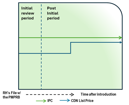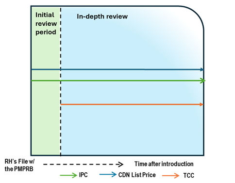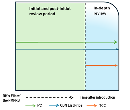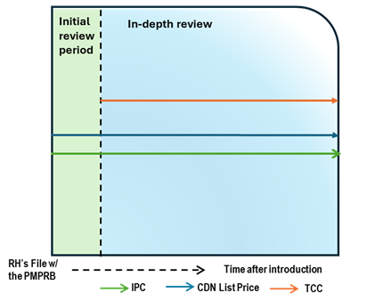 This chart illustrates the case where, after a period of time on the market, the Canadian list price increases greater than CPI, resulting in an in-depth review. During the in-depth review, the TCC is conducted and is below the list price and IPC. The chart is divided into two sections: the green section for the initial price review period and post-initial period prior to the price increase and the blue section for the in-depth review period. The blue line represents the Canadian list price, the green line represents the IPC, and the orange line represents the TCC.