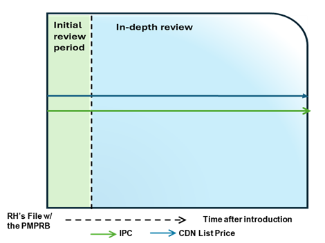 This chart illustrates the case where the Canadian list price is above the IPC, resulting in an in-depth review. The chart is divided into two sections: the green section for the initial price review period and the blue section for the in-depth review period. The blue line represents the Canadian list price, and the green line represents the IPC.