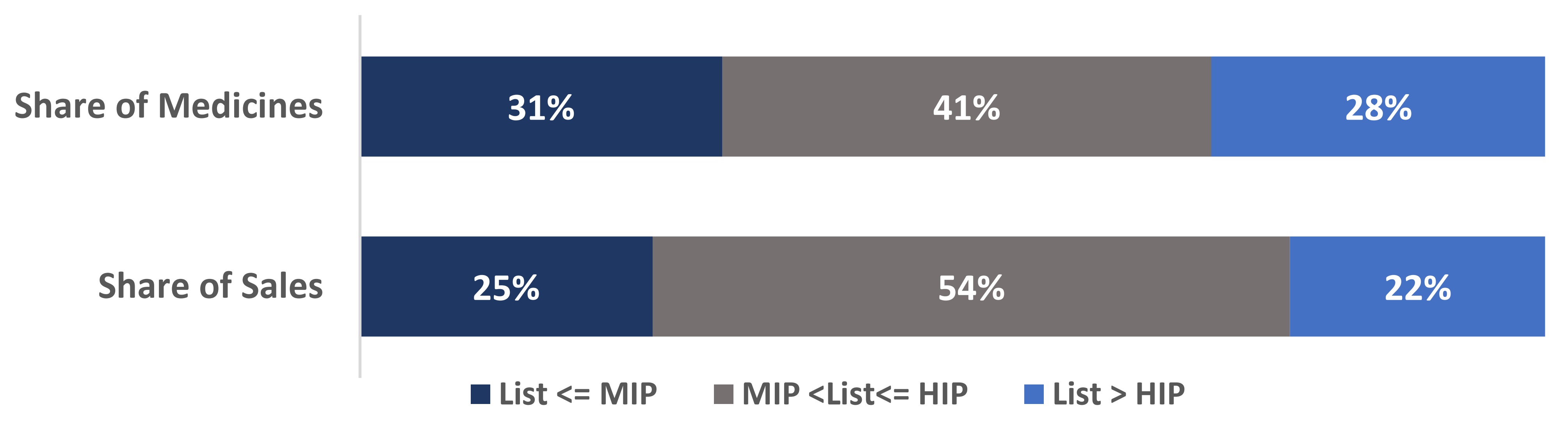 - 69% of all patented medicines had Canadian list prices higher than the median international price (MIP) of the PMPRB11 in 2022, representing 75% of the total sales.