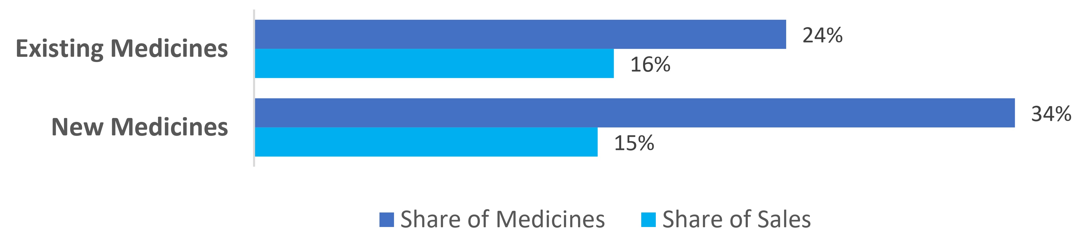 - 24% of existing patented medicines had Canadian list prices below or equal to the MIP of the PMPRB11 in January to June 2023, representing 16% of the total existing medicine sales.