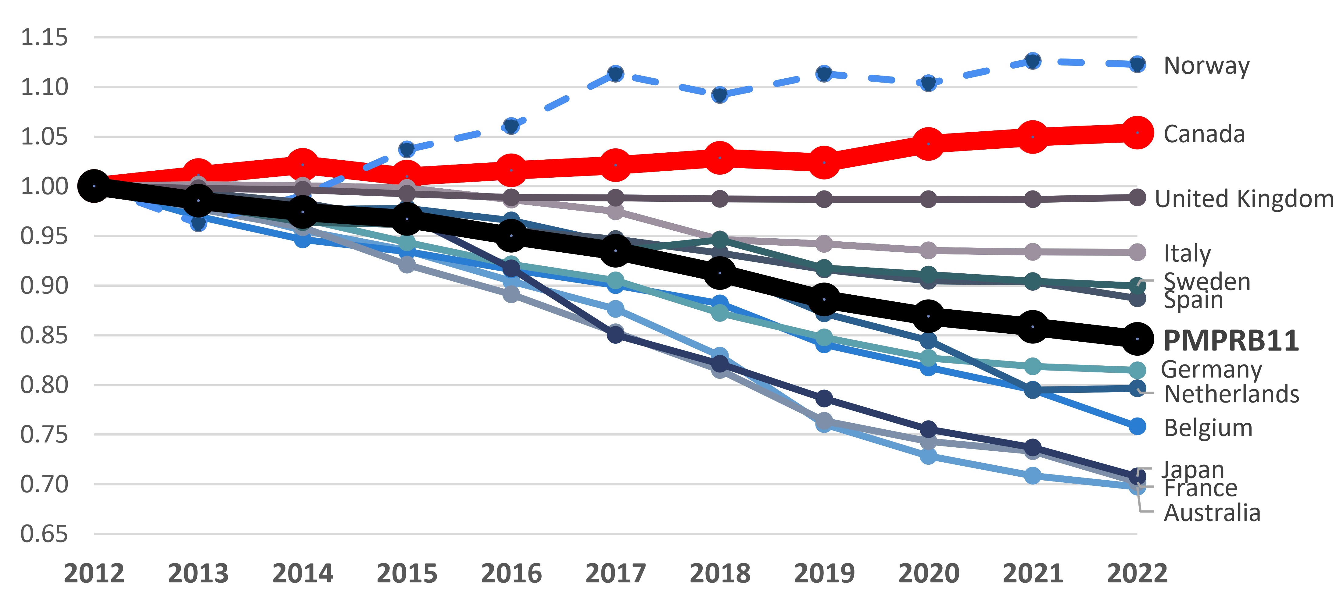 This line graph gives the indexed rate of growth of patented medicine sales for Canada and the eleven PMPRB11 comparator countries over a 2012 to 2022 period.