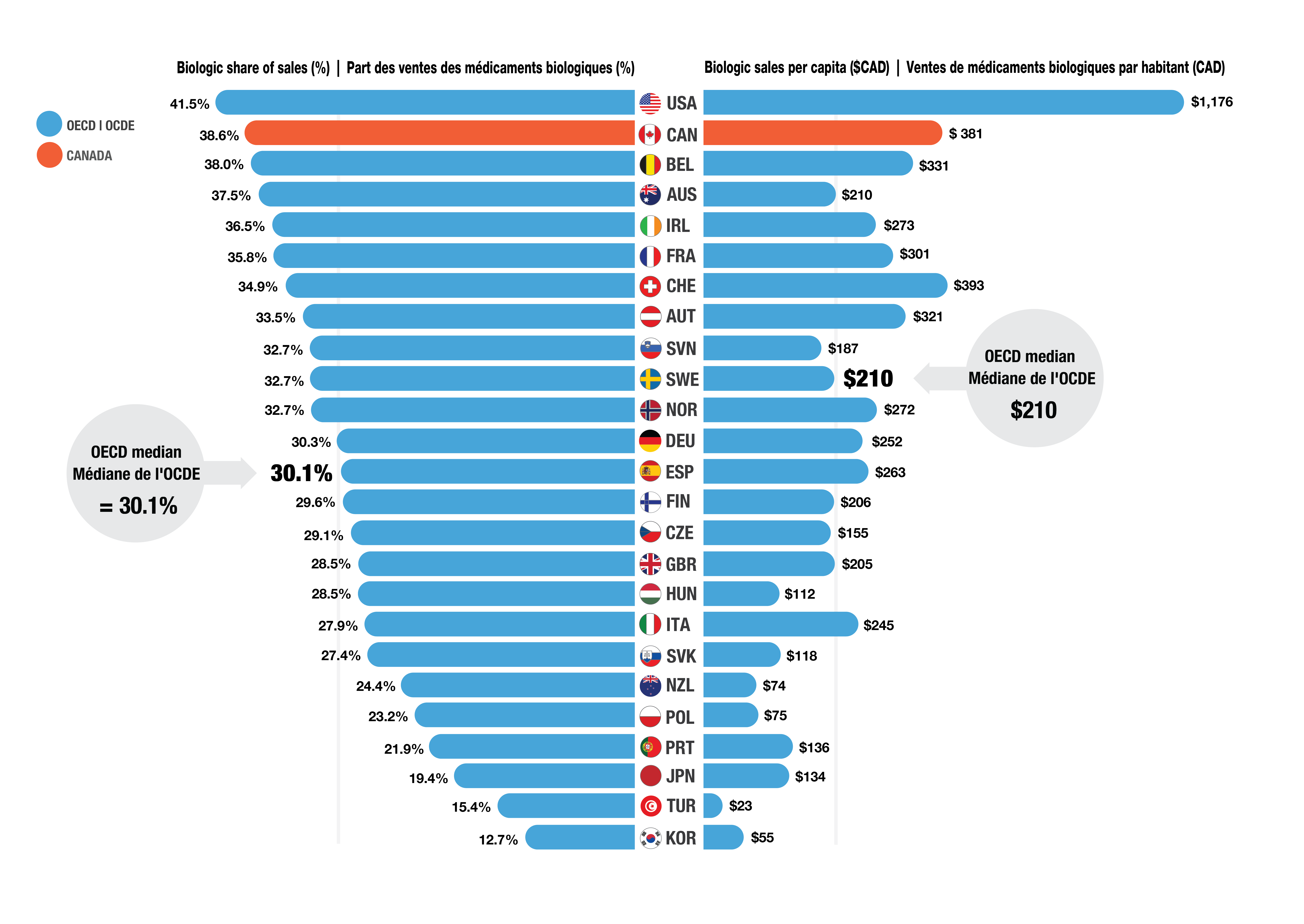 - Per capita spending on biologics was $381, 80% more than the OECD median of $210, placing Canada second to the U.S.