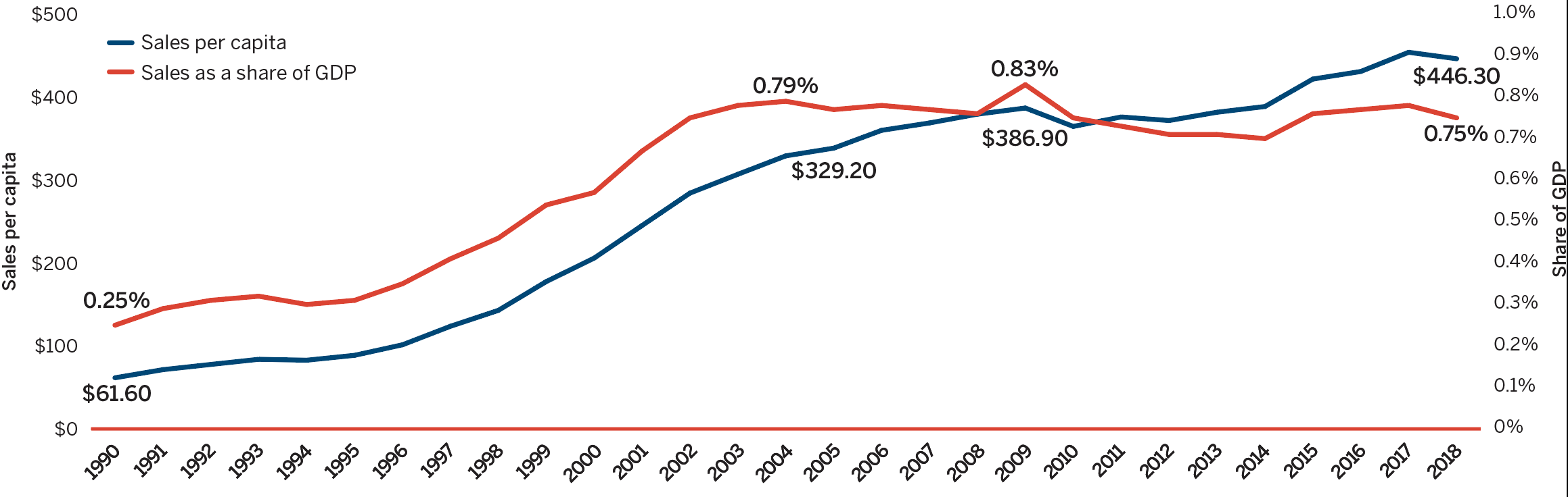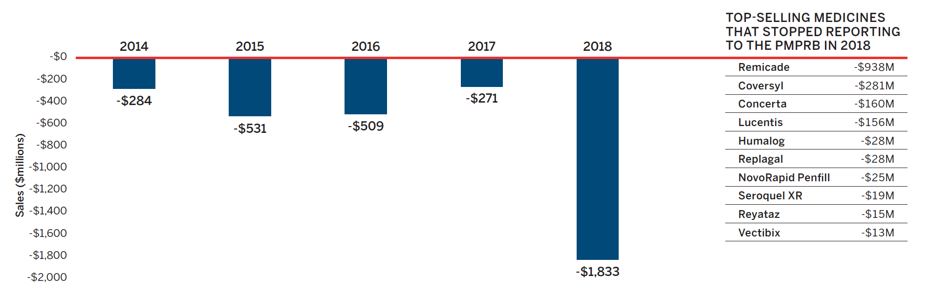 - $16.7 billion in sales of patented medicines in Canada in 2018, decreasing slightly by 0.6% from the previous year.