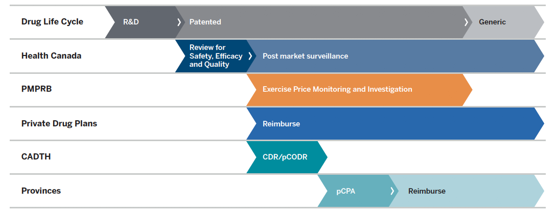 This flowchart illustrates the role of Canadian regulators during the life cycle of a drug through research and development, the patent period, and post-patent generic period. Health Canada reviews for safety, efficacy, and quality at the start of the patent period and provides subsequent post-market surveillance. The PMPRB exercises price monitoring and investigation during the patent period, after Health Canada’s review. Private drug plans reimburse during and after the patented period, following Health Canada’s review. CADTH conducts the Common Drug Review and pan-Canadian Oncology Drug Review processes after Health Canada’s review. For provinces and territories, the pan-Canadian Pharmaceutical Alliance negotiations begin after CADTH reviews, and reimbursement is subsequent to these negotiations.