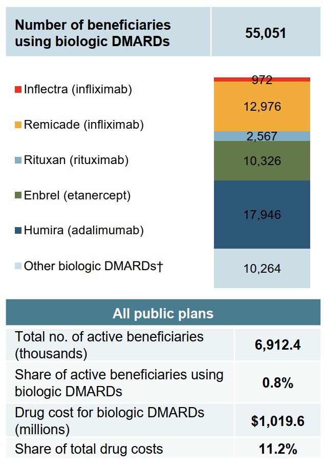 A summary table presents the total number of active beneficiaries across all public plans (6,912,400), the share of active beneficiaries using a biologic disease-modifying antirheumatic drug (0.8%), the total drug cost for biologic disease-modifying antirheumatic drugs ($1,019.6 million), and their share of total drug costs (11.2%).