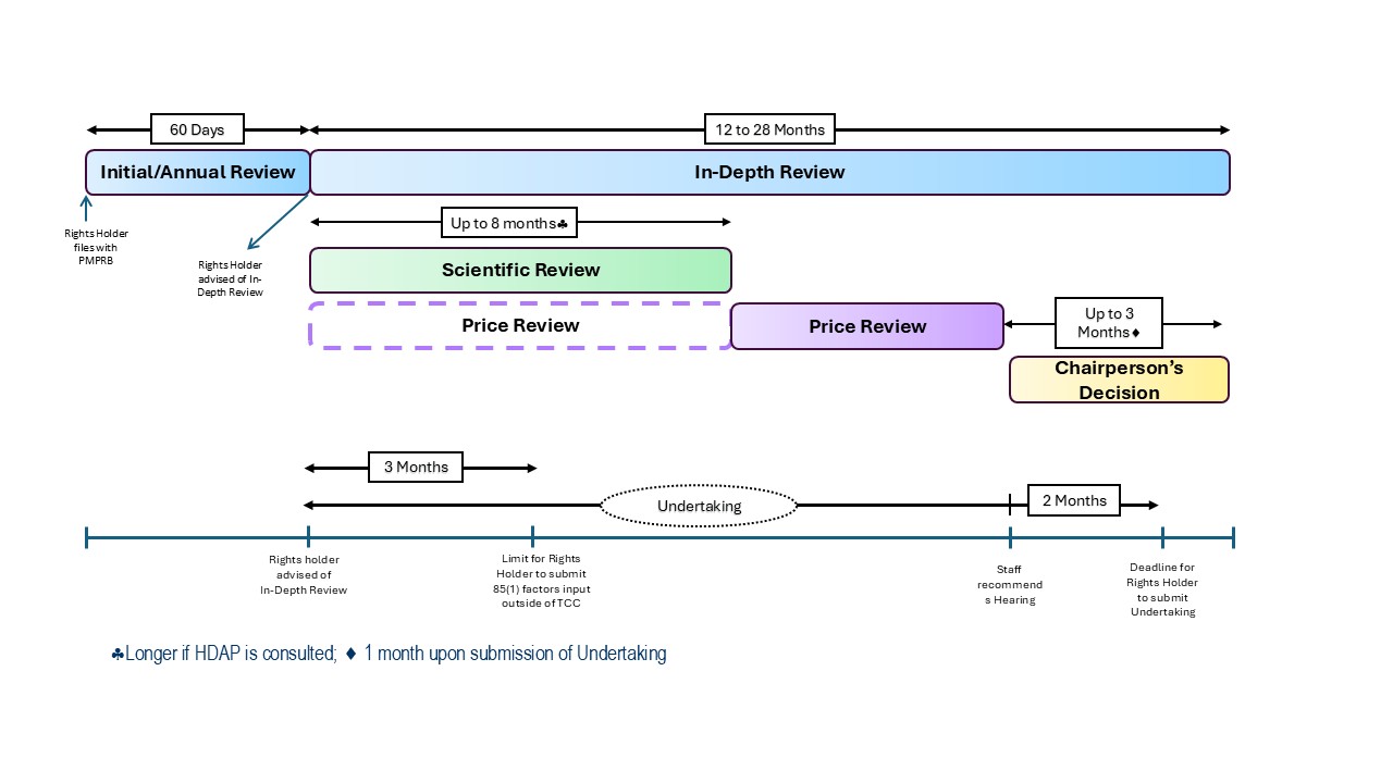A timeline visual depicts relevant service standards for the Initial/Annual Review (60 days), In-Depth Review (12-28 months), Scientific Review (up to 8 months but may be longer if HDAP is consulted, starts concurrently with the In-Depth Review), Price Review (starts concurrently with the In-Depth Review but the main analysis begins after the Scientific Review is completed). Rights Holders have up to 3 months after an In-Depth Review notice is received to submit any relevant information regarding the 85(1) factors they wish to be considered by Staff in their analysis. In addition, the Rights Holder may submit an undertaking for the Chairperson’s consideration up to 2 months after Staff provides their recommendation to the Chairperson. The Chairperson will decide whether to close the review or to issue a Notice of Hearing up to 3 months after receiving Staff’s recommendation. If a Notice of Hearing is issued by the Chairperson, the Rights Holder may no longer provide an undertaking. Instead, the Rights Holder may make a settlement proposal to the Hearing Panel.