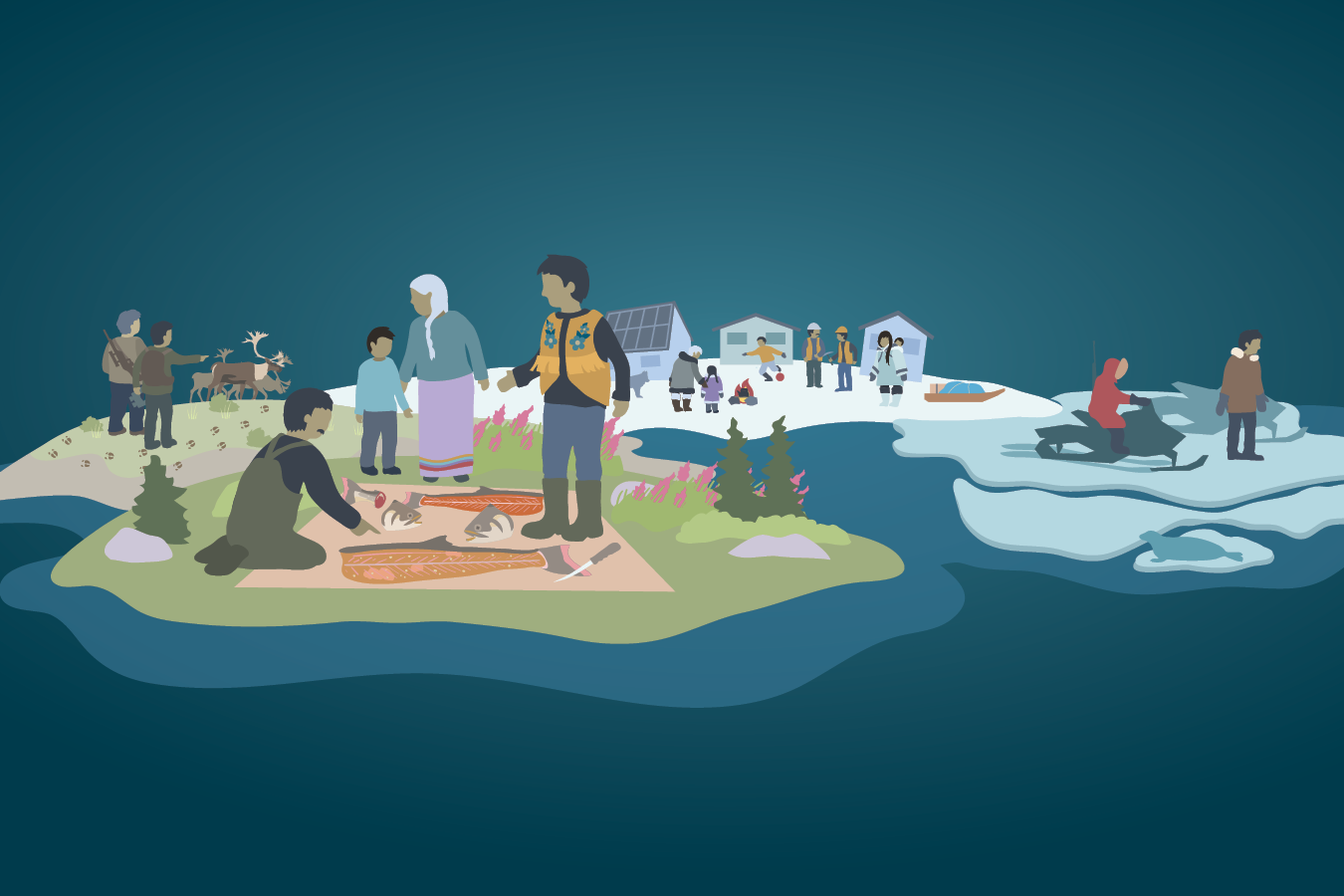 The participants included Indigenous representatives from Nunavut and the Northwest Territories, scientists, and representatives of northern governments and organizations involved in research. They selected themes that represent priority questions in northern communities. Scientists and Indigenous knowledge holders produced technical papers based on these themes. The infographics below are a visual summary.