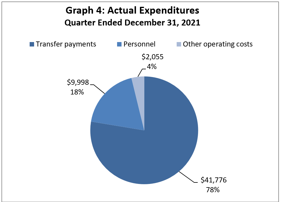 - $41,776 represents actual spending on Transfer Payments, which accounts for 78% of Actual Expenditures quarter ended December 31, 2021