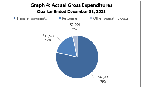 - $48,831 represents actual spending on Transfer payments, which accounts for 79% of Actual expenditures quarter ended December 31, 2023
