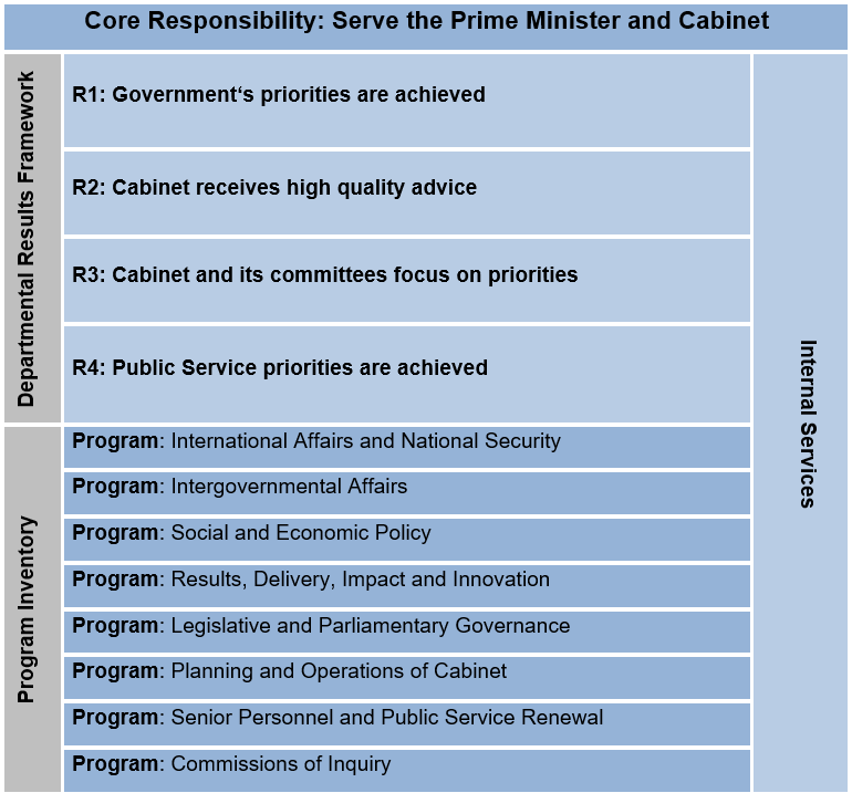 PCO’s Departmental Results Framework and Program Inventory of record for 2020-21 consist of the following:
