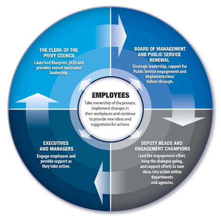 Blueprint 2020 articulates a vision for a world-class Public Service equipped to serve Canada and Canadians now and into the future. The Blueprint 2020 exercise was launched to engage public servants in that vision. Thousands of public servants across Canada and around the world shared their views on what it takes to ensure public service excellence. Taking an active role in shaping a shared vision is galvanizing many public servants who have made this initiative their own and have embraced their role as agents of change.