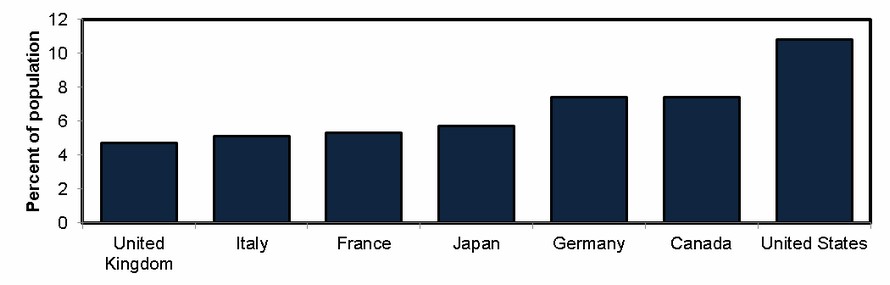 International data on diabetes are estimates of diagnosed and undiagnosed diabetes. Among G7 countries, it is estimated that Canada had one of the highest proportions of people aged 20 to 79 years living with diabetes in 2015 at almost 8%. The United Kingdom was estimated to have the lowest proportion of people living with diabetes at less than 5%. The United States was estimated to have the highest at 11% (see Figure 4)Footnote 7. It should be noted that countries can have different approaches to screening for and diagnosis of diabetes that may affect estimates on how many people are living with diabetes.