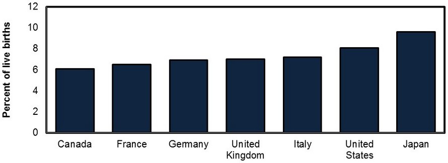 Bar chart showing percent of live births with low birth weight in G7 countries in 2011.