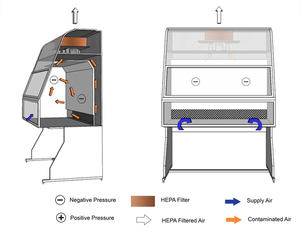 | HEPA-filtered downflow air | Composed of mixed downflow and inflow from common plenum | Composed of mixed downflow and inflow from common plenum | Inflow air | Drawn from the containment zone or from the outside atmosphere |