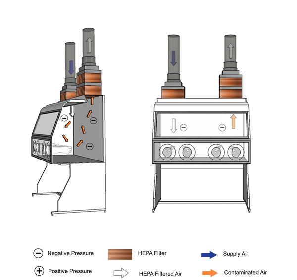 | HEPA-filtered exhaust air | Recirculated to the containment zone or directly to the outside atmosphere | Recirculated to the containment zone or directly to the outside atmosphere | Exhausted through dedicated exhaust plenum to the outside atmosphere | Exhausted through dedicated exhaust plenum to the outside atmosphere |