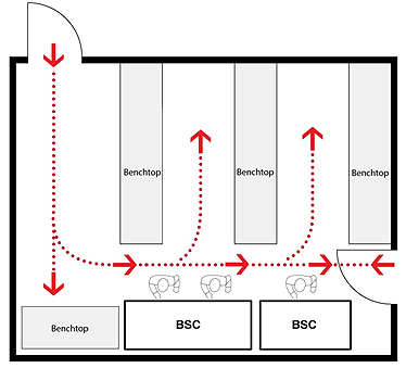 Locating BSCs away from areas where airflow patterns may be disrupted (e.g., room air supply and exhaust grilles, doors, open windows, high traffic areas, and large pieces of equipment that generate heat) will help protect the fragile air curtain at the front of the cabinet (CBS Matrix 3.7). The following recommendations are to be considered with respect to the installation of BSCs: