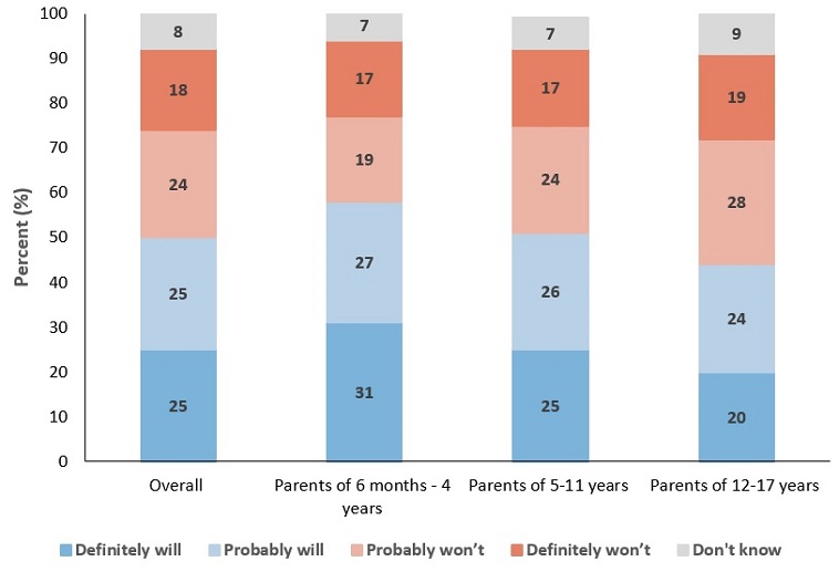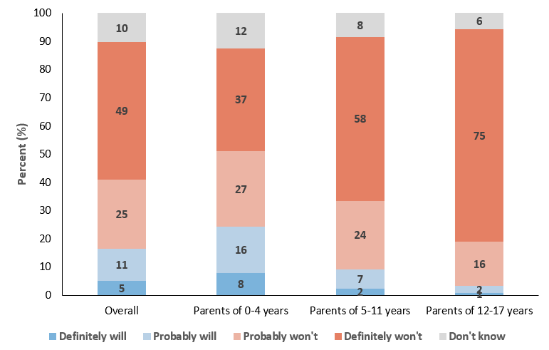 - Twenty percent (20%) of parents/guardians of children 0 to 4 years reported that when their child becomes eligible for a COVID-19 additional dose that they definitely will vaccinate their child, while 25% indicated that they definitely won’t. There was a small difference between males (20%) and females (21%).