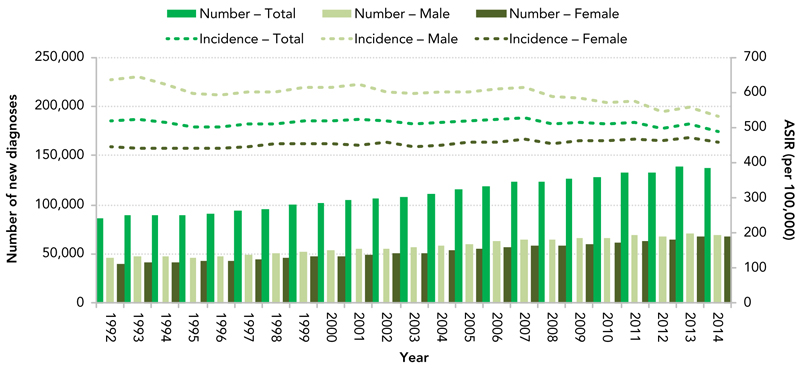 In 2014, approximately 137,000Footnote † Canadians (excluding Quebec) were diagnosed with cancer. Between 1992 and 2014, the number of new cancers diagnosed increased 59%, from 86,000 to 137,000 (Figure 3). However, during the same period of time, the age-standardized incidence rate (ASIR), a measure of cancer risk that removes the effect of age and population size, decreased from 520 per 100,000 to 488 per 100,000 for both sexes combined (Figure 3). In particular, since 2007, the combined ASIR declined by 0.7% per year. Thus, although the number of new cancers diagnosed each year in Canada continues to increase because of the growing and aging population, the risk of developing the disease is declining.