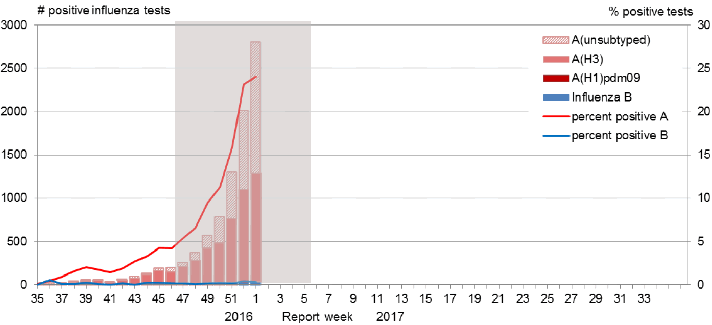 - A total of 2,639 positive influenza detections were reported in week 1, an increase from the previous week. Influenza A(H3N2) continues to be the most common subtype detected.