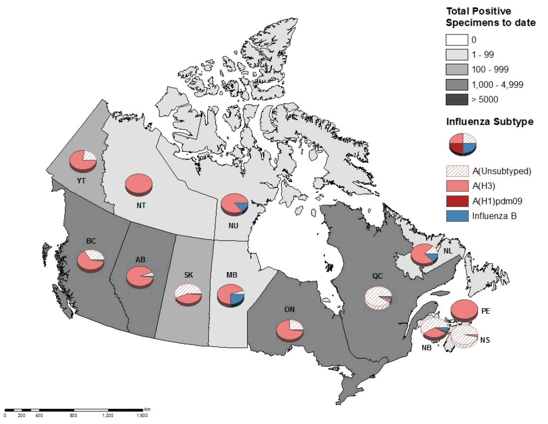 - Overall, greater numbers of laboratory detections, outbreaks and hospitalizations were reported in week 1 compared to previous weeks suggesting that Canada is nearing peak influenza activity.